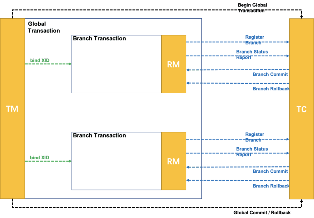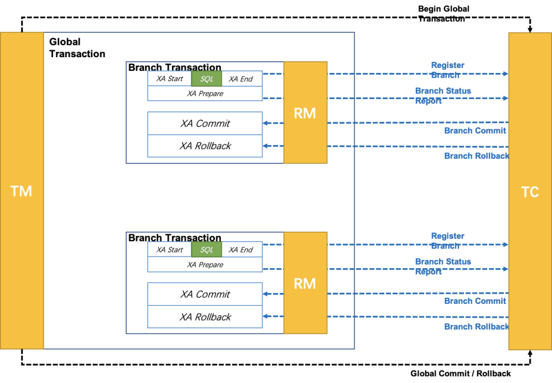 • 事务协调器(Transaction Coordinator) :事务协调器负责协调和管理分布式事务的整个过程。它接收事务的开始和结束请求,并根据事务的状态进行协调和处理。事务协调器还负责记录和管理事务的全局事务 ID(Global Transaction ID)和分支事务 ID(Branch Transaction ID)。
