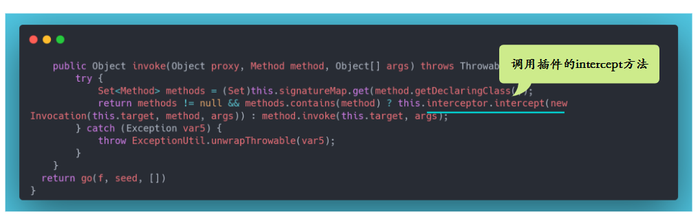 使用 Plugin 生成代理对象,代理对象在调用方法的时候,就会进入invoke方法,在invoke方法中,如果存在签名的拦截方法,插件的intercept方法就会在这里被我们调用,然后就返回结果。如果不存在签名方法,那么将直接反射调用我们要执行的方法。