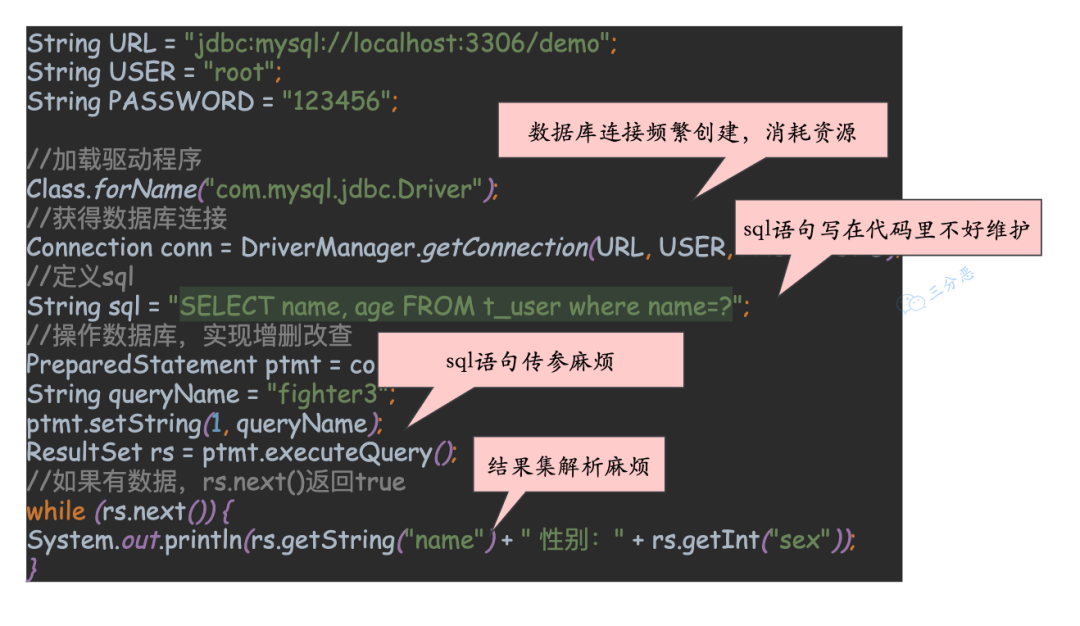 - 3、向sql语句传参数麻烦,因为sql语句的where条件不一定,可能多也可能少,占位符需要和参数一一对应。