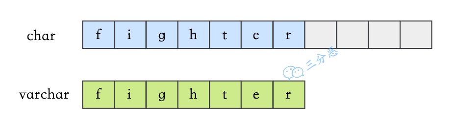 - 如果插入数据的长度小于char的固定长度时,则用空格填充;