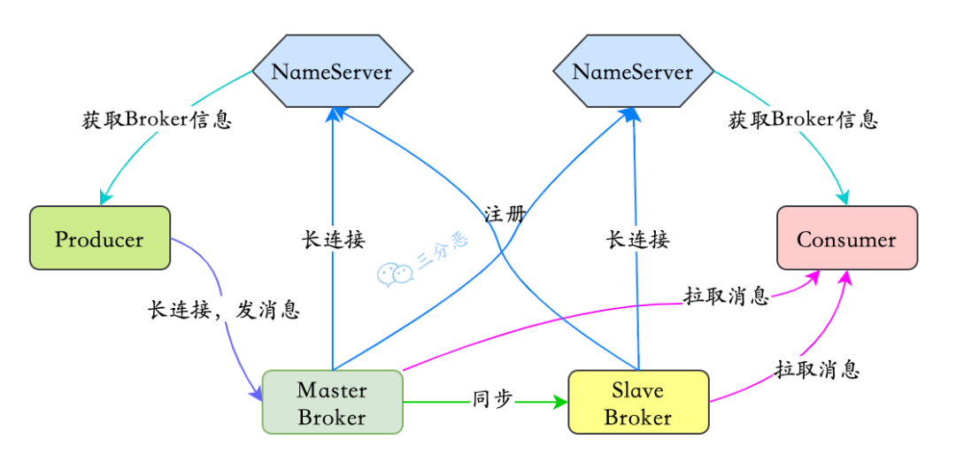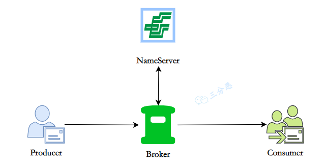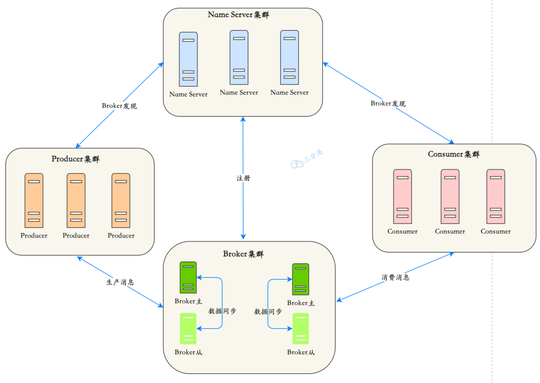 RocketMQ 一共有四个部分组成:NameServer,Broker,Producer 生产者,Consumer 消费者,它们对应了:发现、发、存、收,为了保证高可用,一般每一部分都是集群部署的。