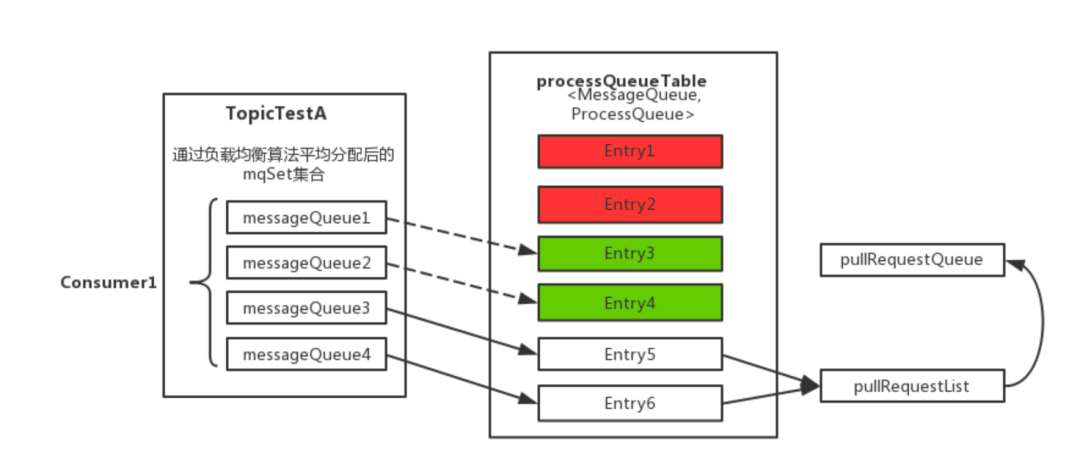 - 上图中processQueueTable的绿色部分,表示与分配到的消息队列集合mqSet的交集。判断该ProcessQueue是否已经过期了,在Pull模式的不用管,如果是Push模式的,设置Dropped属性为true,并且调用removeUnnecessaryMessageQueue()方法,像上面一样尝试移除Entry;