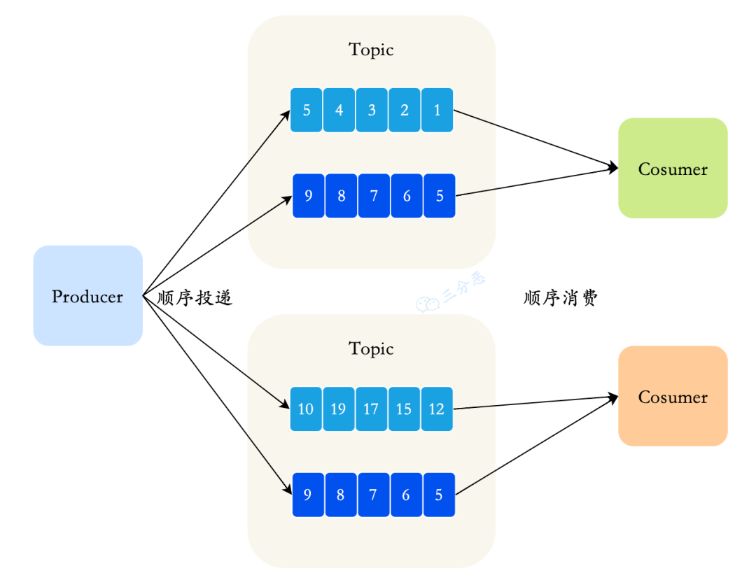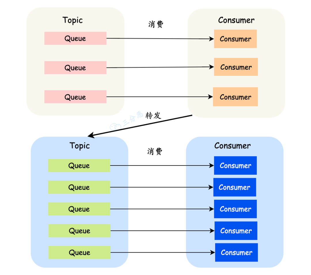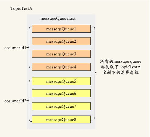Message Queue (消息队列),一个 Topic 下可以设置多个消息队列,Topic 包括多个 Message Queue ,如果一个 Consumer 需要获取 Topic下所有的消息,就要遍历所有的 Message Queue。
