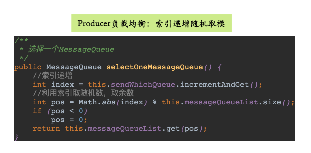 Producer端在发送消息的时候,会先根据Topic找到指定的TopicPublishInfo,在获取了TopicPublishInfo路由信息后,RocketMQ的客户端在默认方式下selectOneMessageQueue()方法会从TopicPublishInfo中的messageQueueList中选择一个队列(MessageQueue)进行发送消息。具这里有一个sendLatencyFaultEnable开关变量,如果开启,在随机递增取模的基础上,再过滤掉not available的Broker代理。