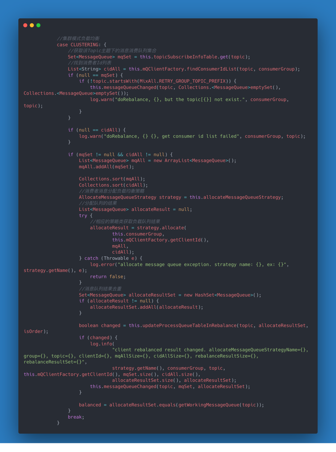 通过查看源码可以发现,RebalanceService线程的run()方法最终调用的是RebalanceImpl类的rebalanceByTopic()方法,这个方法是实现Consumer端负载均衡的核心。