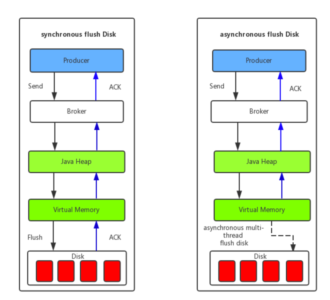 - 异步刷盘:异步刷盘是指消息达到Broker内存后就返回Producer数据已经发送成功,会唤醒一个线程去将数据持久化到CommitLog日志文件中。