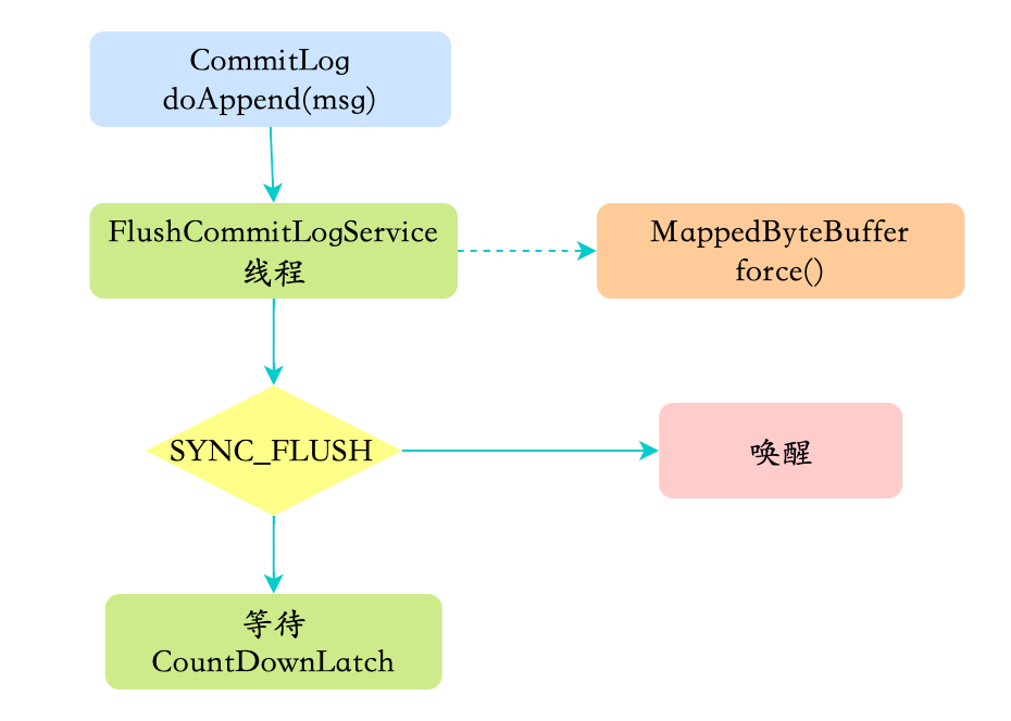刷盘的最终实现都是使用 NIO 中的 MappedByteBuffer.force() 将映射区的数据写入到磁盘,如果是同步刷盘的话,在 Broker 把消息写到 CommitLog 映射区后,就会等待写入完成。