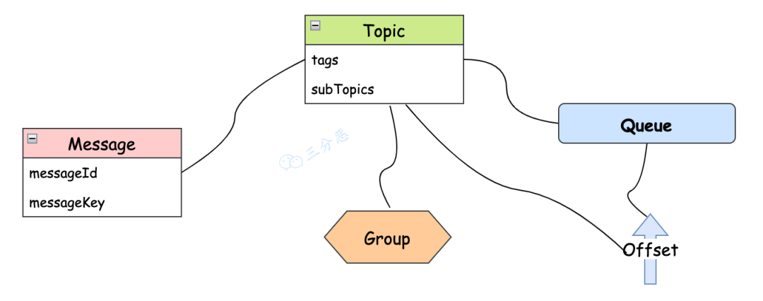 RocketMQ的消息模型中,这些就是比较关键的概念了。画张图总结一下: