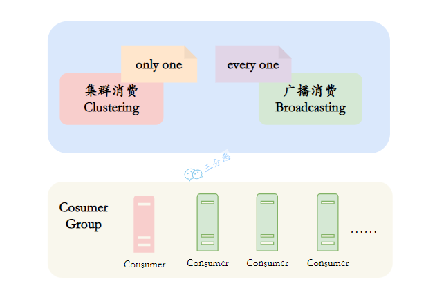 而广播消费消息会发给消费者组中的每一个消费者进行消费。